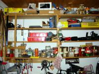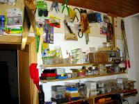 anderer Raum mit Farbregal und im/auf dem Schrank Vorräte an Elektromaterial, im verdeckten Schränkchen noch diverses Maurerwerkzeug: