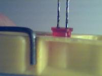 Zwischen den Anschlüssen ist nicht viel Platz, hier mal Bilder (hab nur ne billige Webcam) vom Prototyp, ist eine alte, gebrauchte LED gewesen, deswegen verzinnt. Jetzt noch einen Tropfen Epoxy und es ist perfekt. Bei einem Abstand von ca. 5mm zur Platine sieht man nix