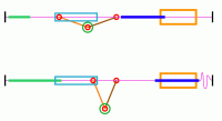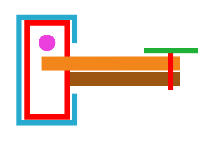 Der orangene Kasten ist eine Spule, die ist schnell gewickelt. Der blaue Strich ist ein Eisenstab. Die dünne violette Linie ist eine Schnur (links und rechts am Schwarzen festgemacht), der hellgrüne Balken links ist eine Rückholfeder. An den roten Kreisen sitzen Drehgelenke. Die rechte Drehachse ist fix, der linke Kreis/Zylinder/Bolzen kann sich in der türkisenen Führung bewegen und ist außerdem an der Schnur befestigt. Der grüne Kreis ist ein Gummi- oder Kunststoffrad. Die beiden Linien in ocker und braun sind Stäbe, die über die Drehgelenke verbunden sind.