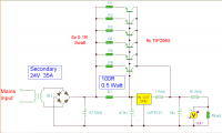 Im Anhang findet ihr einen Schaltplan nach welchem ich ein 15V und ein 12V Netzteil auf einer Platine und nicht an einem trafo sondern an einem anderem stab. NT (testweise)angeschlossen habe. Im Prinzip ist meine Schaltung genau wie die in der Skizze, nur habe ich um 12V und 15V zu bekommen alles nach den 47000 uF Kondensatoren (ich habe 2 4700 uF genommen) doppelt gebaut. Habe für den 12V stromkreis 6 TIP3955 und für den 15V stromkreis 4 TIP 2955 verwendet. habe an alle die 0,1 ohm 5 Watt Emitterwiderstände angeschlossen und verbunden. die beiden Spannungsregler LM 7812 und 7815 liefern auch eine akzeptabele ausgangsspannung. zu meinem problem: