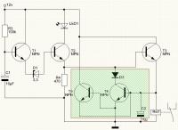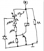 Der Plan ohne das grün Schraffierte schaltet das Relais schön verzögert, und das Schraffierte soll, sobald C2 geladen ist und T4 durchschaltet, T3 abschalten und sich über T5 selbst erhalten. T5 macht mir am meisten Gedanken, funktioniert das so?