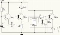 R7: Wenn T2 und T4 durchgeschaltet sind würde ich nen Kurzschluss machen der mir die Transistoren und die LED killt.