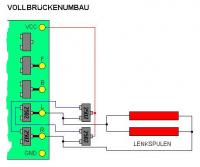 Wie gesagt hatte ich schon eine Schaltungserweiterung vorgenommen (mit Mosfet) die es ermöglicht den Motor immerhin in rechts/links Lauf zu bringen. Im Normalfall gibt es diese Schaltung nicht, da hängen an den Transis ja 2 Spulen. Beide Spulen sind gegen + angeschlossen. Bei normalem Anschluß geben also beide Lenkrichtungen die selbe Spannung ab, bzw. schalten die Transistoren gegen Masse (vermute ich zumindest).