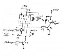 Die Diode D4 ist außerdem immer noch an der falschen Stelle. Die 12V von der Batterie sollen direkt auf die Spule und auf D4. D4 kommt mit dem Widerstand R10(so 22 Ohm) in Reihe. Dahinter kommen dann die Kondensatoren und die ZD und das ist dann die Versorgungsspannung für den 555er.