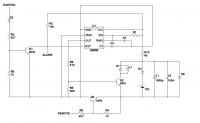 Die Alarmanlage hat einen Anschluss, der auf Masse gezogen wird, wenn sie aktiviert ist, also darf die Schaltung nur arbeiten, wenn dieser Anschluss von Masse getrennt ist.