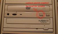 Die meisten besitzen eine Play-Taste neben dem Auswurfknopf. Die könnte man anzapfen und wenn Potentialtrennung gewünscht, auch mit einem Relais oder Optokoppler arbeiten. Dann noch PC-Lautsprecherboxen ran ans Laufwerk und gut ist. Dann muss nur noch die "dröhnende Datei" als Audio-CD gebrannt werden. Das Laufwerk kann man gut mit einem alten PC-Netzteil betreiben*, es gibt aber auch Laufwerke, die _nur_ 5V brauchen. Dann reicht auch ein stabilisiertes Steckernetzteil.