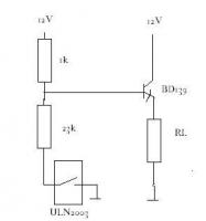 Wenn ich das richtig sehe, sollte es auch so gehen, wie eingezeichnet: Dazu muss der Kollektor des Transistors an die Kathode der Last, der Emitter auf Masse und die Basis über z.B. ein paar kΩ an 12V. Nun ist dieser Transistor solange geöffnet, bis kein Strom mehr durch die Basis-Emitter-Strecke fließen kann. Das erreicht man dadurch, dass man den Transisotr im ULN durchschaltet: er zieht die Basis des anderen Transistors auf Masse -> der sperrt.