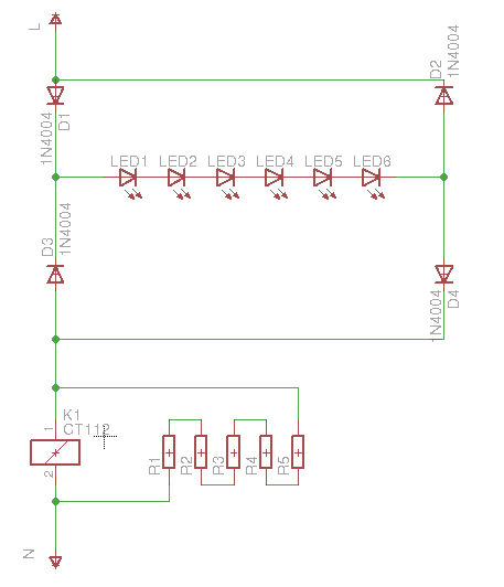 Das Relais fungiert gleich als Vorwiderstand für die Leuchtdioden. An 6 weißen LEDs in Reihe werden etwa 20V abfallen, bleiben 210 Volt für das Relais. Das sollte damit immer noch zuverlässig anziehen. Bei 210V und einem Innenwiderstand von 28kΩ fließen noch etwa 7,5mA durch das Relais und durch jede LED.
