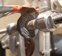 Langsam komme ich meiner Vorstellun einer Kreutzwickelspule schon näher; es ist eine Einstellungsfrage der Umdrehungsgeschwindigkeit zur Bewegung des Führungsarmes nach Versuch und Irrtum  . Der Probedraht sieht auch schon entsprechend aus.