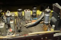 Genau mit sowas hatte ich auch gerechnet, aber nichts gesehen. Das Gerät hat übrigens im Gegensatz zur etwa gleich alten Dioletta keine gedruckte Schaltung sondern die meisten Bauteile sind zwischen zwei Lötleisten aufgespannt, die Röhrenfassungen sitzen auf einer Blechplatte.