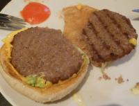 Das erste Bild zeigt ein Bild dessen, was man erwarten kann; das zweite und dritte Bild zeigt das, was man bekommt. Die Tomatenscheibe war nicht drauf, die war von einem anderen Burger.