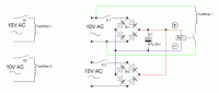 Richte die beiden Türöffnerspannungen mit je einem Grätzgleichrichter gleich und schalte die beiden entstehende Gleichspannung polrichtig auf ein 12 V Koppelrelais.(Diodenoder) Der Arbeitskontakt sollte dann die 10 V AC zum Türöffner durch schalten. Durch die beiden Gleichrichter sind die Sprechstellen entkoppelt und das Relais schaltet den Türöffner von beiden Sprechstellen!
