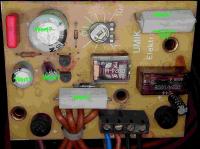 Kann es sein, dass der Minuspol des gelb markierten Kondensators abgerissen ist?