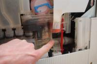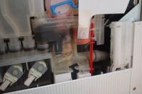Ich kann nicht genau erkennen, wo das Wasser aus dem Niveaugeber leckt. Es tropft unterhalb des roten Teils, an dem die weisse Kunststoffabdeckung geklebt ist. Am Styropor-Schwimmer unten in der Maschine steht etwas Wasser.
