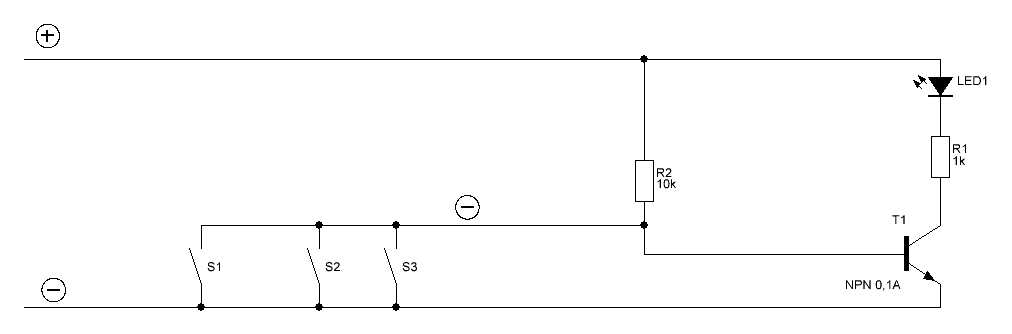 T1 schaltet den C durch, wenn durch B ein Strom abfließen kann. Dieser fließt über R2 auf Plus, sofern S1-S3 nicht geschaltet sind. Sonst würde aufgrund des geringeren Widerstandes der Strom direkt von Minus nach Plus laufen, für den T1 nicht genüg "über sein" und dieser nicht durchschalten.