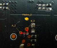 Damit es nachher keine Kurzschlüsse gibt: Kratze bitte vorsichtig den Lack an „Fläche_1“ weg. Miss von dort den Widerstand nach A und B, in beide Richtungen, notiere es.