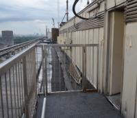 Im ersten Bild sieht man den Ausgang zum Dach, rechts die gerade offene Tür. Die Tür im Zaun ist die, für die es nur zwei Schlüssel gibt, von denen einen wir haben. Der zweite Schlüssel wird nur ganz selten ausgegeben. Außerdem schrieb ich zuvor, will wer aufs Dach, muss er an uns vorbei. Somit haben wir Kontrolle, wenn sich Personen auf dem Dach aufhalten wollen. Der Sendebetrieb, sofern die angesprochene Antenne überhaupt benutzt wird, wird dann eingestellt. Die wenigen Personen, die es bis zum Dachausgang auf das Laufgitter geschafft haben, müssen immer noch die letzte Hürde überwinden, wenn sie zur Antenne wollen.