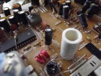 Rechts unten, vom Netztrafo aus gesehen, ist ein Elko den Du ja auf Verdacht auswechseln kannst. Kostet nicht viel.