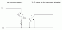 Ah jetzt! Die Transe T1 im Sensor schaltet bei Betätigung durch und sorgt somit für einen Stromfluß der Basis von T2. Somit schaltet Masse durch und ich habe ein negatives Signal. Jetzt mal mit meinen laienhaften Worten ausgedrückt...