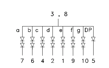Was ist da unverständlich jedes Segment besteht aus 2 in Reihe geschalteten LED und auch so werden die betrieben also + an 3+8 und vom Segment A geht es über den Vorwiderstand nach Minus!