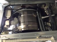 Unten Blende abnehmen, TORX lösen, Ring ums Gummi, Zentralmutter der Front, dann abnehmen.