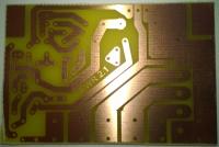 Der erste Entwurf der Platine ist fertig - mit 3 Jahre altem Platinenmaterial (Bungard) und ebenso altem Natriumhydroxid aus der Apotheke. Daß dieses überhaupt noch verendbar war hat mich etwas überrascht. Schließlich war es trotz originalem Schraubbecher völlig verklumpt und etwas schleimig-matschig.