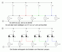 Ohne weitere Maßnahmen machst du dann mit jedem Schalter alle Leisten an. Daher die Lösung mit den Dioden, nur erfordert die eben zwingend Gleichspannung.