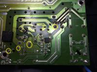 Also, das Netzteil versucht zu starten (klacken) kann es aber nicht weil entweder die Spannung zusammenbricht, hier wären als mögliche Ursachen der Stützelko und ein eventuell hochohmiger Startwiderstand für den LD7575 Schaltregler (der IC auf der Lötseite).