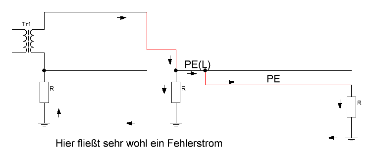 Für den FI ist auch in diesem Fall die Welt in Ordnung, denn die Summe der hinein und heraus fließenden Ströme ist Null. Der Strom der vom PEL zum PE abfließt wird ja gar nicht vom FI erfasst,da er an diesem vorbei fließt.