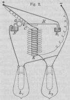"doppelter Bewickelung versehenen Elektromagnet; die Windungen des einen (dicken) Drahtes sind denen des anderen (dünnen) Drahtes entgegengesetzt geführt; Stromstärke und Windungszahlen sind derart bemessen, daſs der Anker des Hebels H bei normaler Stromtheilung nicht angezogen wird. Der Strom tritt bei + ein, durchläuft den Elektromagnet, die Lampe L2 und tritt bei – aus; nur ein sehr geringer Zweigstrom durchflieſst die dünnen und zahlreichen Windungen der dünnen Elektromagnetbewickelung. Wenn nun L2 durchgebrannt ist, wirkt der Strom dieser dünnen Bewickelung allein auf den Kern: H wird angezogen, taucht mit dem rechten Arm des um das Gelenk C drehbaren Hebels, dessen Laufgewicht G zum Reguliren dient, in den Quecksilbernapf N1 und dann geht der Strom von + zu N1 , von hier zum Napfe N durch L1 sowie zu den anderen Lampen über – hinaus. L1 wird also glühen; dies thut die Lampe auch mit zuverläſsigster Gleichmäſsigkeit. Die Regulirung kann so empfindlich als möglich gemacht werden; jeder vorüberfahrende Wagen setzt die Lampen beide in Thätigkeit."