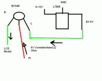 Die Funktioniert auch in dem ich den Strom mit einem Transitor einschalte. Der Steuerstrom wird direkt von einem Ausganspin eines PFC8474 auf den Transistor geschaltet und der LCD Display leuchtet. Funktioniert auch. Aber durch die langen Leitungen habe ich Spannungsverluste und die LCD Module leuchten nur schwach. Ich habe nun 12 V Versorgunspannung an die LCD Display gelegt und mittel einen Festspannungsreglers die Spannung auf 5 V reduziert. Aber ich kann das Licht nicht mehr schalten. Anliegend habe ich versucht eine Zeichung meiner Schaltung zu erstellen. Prinzip: die 5 V des Fespannungsregler habe ich auf den Collektor des BC548 gelegt, den Emitter auf die LCDBeleuchtung, die Bais wird vom PCF8575 angesteuert. Ich vermute, dass irgendwie eine gemeinsame "Masse" fehlt. Aber alles läuft auf Plusspannnug.