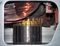Anschließend waren die Lamellen des Kollektors dran, immer gegen den nächsten Nachbarn. Meist lag der Widerstand im Bereich 2-5 Ohm, bei einer Lamelle wurde jedoch gegen beide Nachbarn ein Wert von ca. 120 Ohm gemessen (reproduzierbar). Das ist die im Bild mit der freigekratzten Markierung.