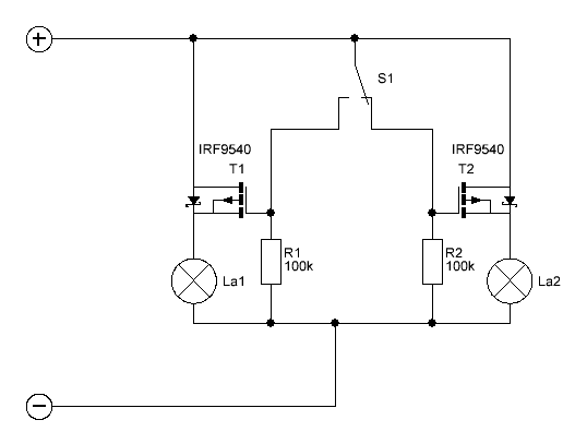 Perl hast natürlich recht da war nicht nur ein Denkfehler ! Hier mal das Ganze mit NPN-Transistoren , die könnten auch mit N-Kanal Fet ersetzt werden.