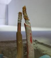 | | Das muss man sich mal vorstellen! Einzeladern auf Porzellanrollen in diesen Holzständerwänden und nirgends Abzweigdosen sondern alles auf kurzem Weg in der Wand per Lötverbindung abgezweigt! Teilweise L und N für absoluten Kurzschlussschutz in getrennten Feldern der Wand verlegt und nur bei der Gerätedose durch einen Ständer durchgebohrt. |
