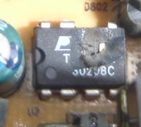 Leider kann ich die Typenbezeichnung des ICs nicht mehr lesen, da Teile des Gehäuses fehlen. In der letzten Zeile meine ich ein "30208C" zu erkennen, bin mir aber nicht 100% sicher. In der Zeile darüber kann ich nur ein "T" erkennen, oben Reste von einem Logo ("P"?, evtl. Pericom?), der Rest fehlt.