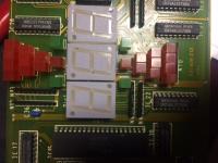 Neben der 7Segmentanzeige sitzt der Prozessor, daneben ein ROM (das Ding mit dem Etikett), daneben ein Static RAM und daneben versetzt ein Käfer mit der Beschriftung EXEL.