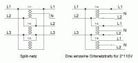mal um gezeichnet: Versorgung erfolgt aus dem Mittelspannungsnetz mit 3*120 Grad verschobenen Außenleitern. Da ja ein Trafo in der Mitte auf der Sekundärseite geerdet ist hast du an diesem Trafo 2*110V gegen N aber von jedem anderem Außenleiter 208V gegen N ! Solange die 3 L Symmetrisch belastet werden kommt es zu keiner Schieflast, das ändert sich aber gewaltig wenn der Trafo mit Mittelanzapfung noch zusätzlich mit 110V Verbrauchern belastet wird! Das rechte Bild sind dann 3 auch räumlich getrennte Trafos! Hier kommst du aber nicht an den L1 oder L2 der anderen Trafos ran! Deshalb gibt es wegen der fehlenden Verkettung auch keine 208 V !