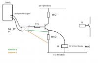Der 25 k Ohm Widerstand ist etwas groß gewählt - in der Hoffnung, dass die zum Einsatz kommenden 12 Volt möglichst maximal hier anliegen und das Relais K1 mit 11-12 Volt versorgen.