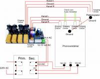 Der 7812 vom Phonoboard hat Reserven, da sind ja nur zwei OPV drauf. Also 12 V DC vom Phonoboard abzweigen und damit den DC Zweig der Umschaltplatine versorgen. Also nach den Dioden des AC Eingangs der Umschaltplatine. Dann kann ich alle Masse bzw. 0 V Anschlüsse ordentlich miteinander verbinden. Die zwei NF Leitungen vom Ausg. Umschaltplatine zum Eing. Phonoboard geschirmt ausführen.