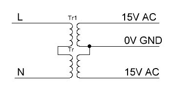 Das ist völliger Schwachsinn! Hinter der Gleichrichtung sind nicht umsonst 2 Spannungsregler. Die eigentliche Schaltung wird mit +/- 12V betrieben, daher muß der Trafo mehr 3V mehr als diese 12V liefern. Zwischen den beiden äußeren Anschlüssen brauchst du also ca. 30V Wechselspannung, zwischen den äußeren und der Mittelanzapfung ca. 15V Wechselspannung.