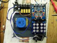 Der Verstärker bekommt weniger als die Hälfte der benötigten Betriebsspannung, die Masse schwebt irgendwo bei ca. 6V rum, statt auf einem definierten Potential zu hängen. Aus den ca. 6V können die Regler auf der Vorverstärkerplatine auch keine sauberen 2x12V erzeugen. Das ist schlicht und einfach ein falscher Aufbau und ein falscher Netztrafo.