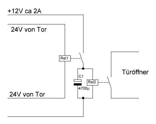 Abfallverzögertes Relais oder schlicht und einfach einen NE 555 dafür verwenden. Evl reicht auch schon ein dicker Elko parallel zum Relais, aber Achtung das kann die Steuerung überlasten. Wie gesagt mit dem 24 V Relais das 12V Relais parallel dazu den Elko und mit dem 12Relais den Türöffner ansteuern. Die Kontakte des 24V relais müssen den Ladestrom für den Elko vertragen!