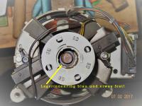 Der Tachogenerator ist das Teil mit den 2 gelben Leitungen, der blaue Lagerring ist evtl. der Magnet (falls nicht, fehlt er?) der sich mitdrehen muss, ansonsten kann der Generator keine AC-Spannung erzeugen und der Elektronik mitteilen wie hoch die Drehzahl ist.