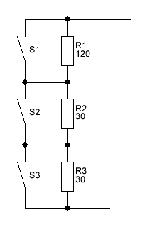 Voll S1+S2 +S3 geschlossen ergibt 0 Ohm, S1+S2 >> 30 Ohm und Nur S1 geschlossen demzufolge 60 Ohm und alle 3 Schalter offen demzufolge 180 Ohm.