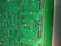 Wo sich der Elko in Luft aufgelöst hat sieht es aus als wäre da was aus dem Elko gesuppt und hätte die Leiterbahnen der Platine zerfressen.
