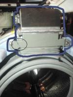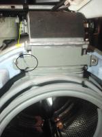 Das Teil mit der Isolation ist der Warmluftkanal, das große runde Teil (Bild2, oben links) ist der Lüfter und das Teil mit den zwei Anschlüssen ist ein Temperaturbegrenzer. Der Trommelantrieb und die Ablaufpumpe befinden sich unterhalb der Wascheinheit.