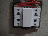 Alle Steckdosen sind 2 adrige (L/N) Aufputzsteckdosen (250V/16A) ohne Erde von Haco Thailand. Die 2 Kabel (Rot/Schwarz) kommen aus einem Rohr in der Wand.