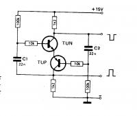 Nach Anlegen der Betriebsspannung gehen die beiden Transistoren mehr oder weniger direkt in den leitenden Zustand und es fließt ein konstanter Emitterstrom von 5 bis 6 mA. Die beiden Emitter liegen dann auf 7,5V.