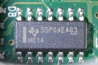 Das wird ein 74HC14 von TI sein. Hier das Datenblatt.