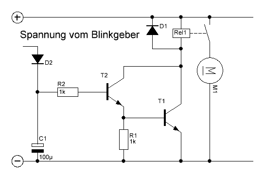 Zur Funktion der Erste Blinkimpuls lädt den Elko sofort fast vollständig auf, somit steuern die Transistoren voll auf und dein Relais zieht an . Über das Relais wird dein Winker geschaltet.